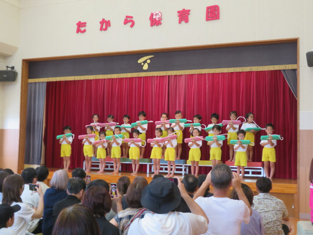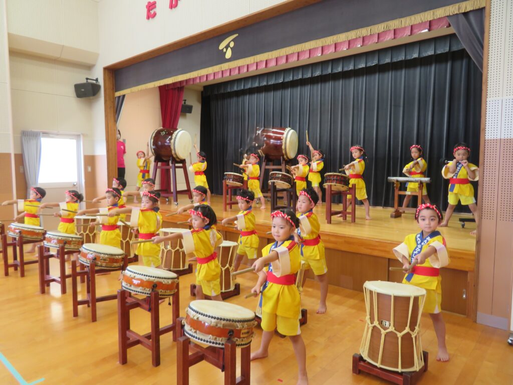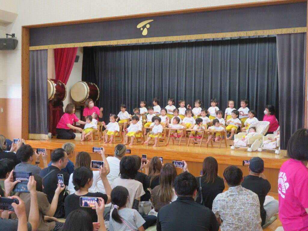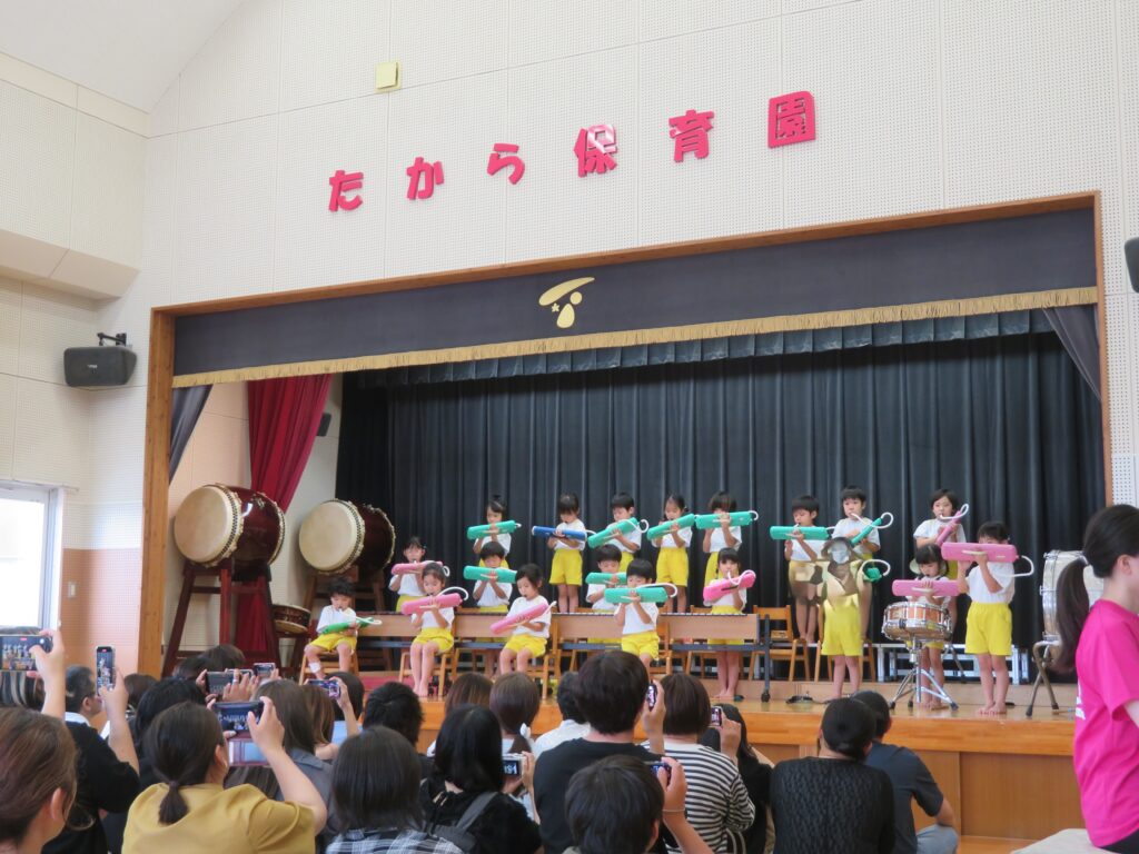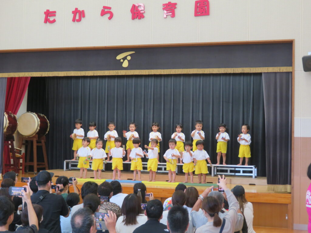 ばら組0歳児のお友だちは、初めての発表でしたが幕があくと涙はどこかに・・・(*^_^*)笑顔で発表することができました。ひまわり組の年長児は、和太鼓を発表しました。力強い和太鼓でした☆!!