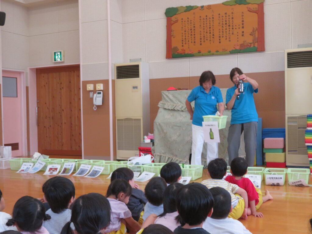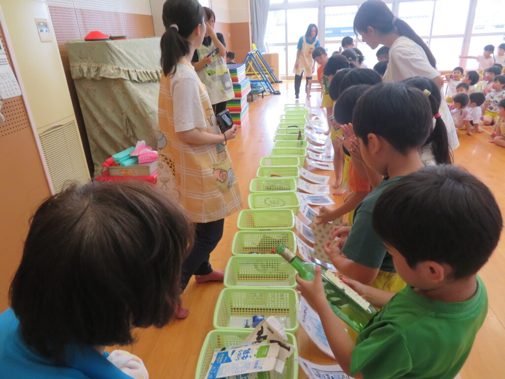 ゴミについてや資源ごみの分別を学びました。年長組は、資源ごみを分別ゲームに挑戦!!マークを見て分けることができました!(^^)!