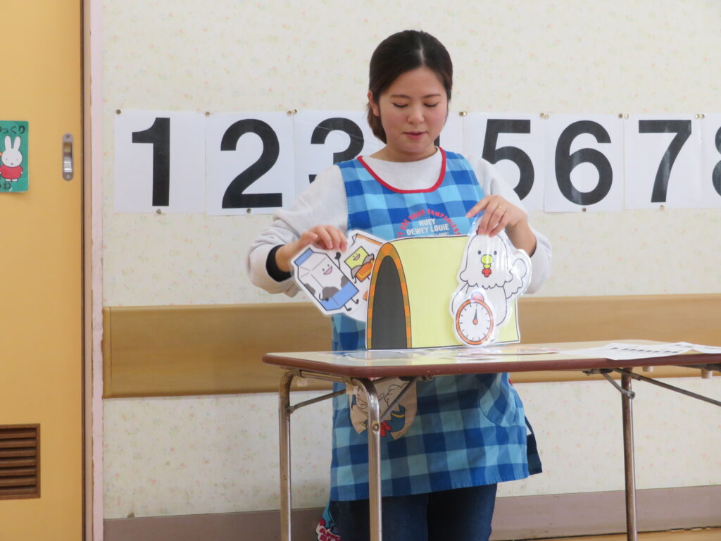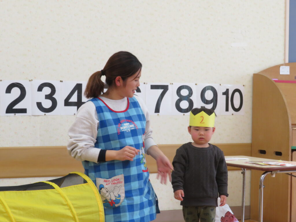 お話しでは、゛変身トンネル”がでてきてみんな???。何に変身するかワクワクのようでした。最後は、美味しそうなケーキに変身!!それから・・・お誕生日のお友だちもトンネルをくぐると~「2さいのお兄ちゃん」に変身☆彡(^^)/!! おもしろ可愛いお話しでした♪