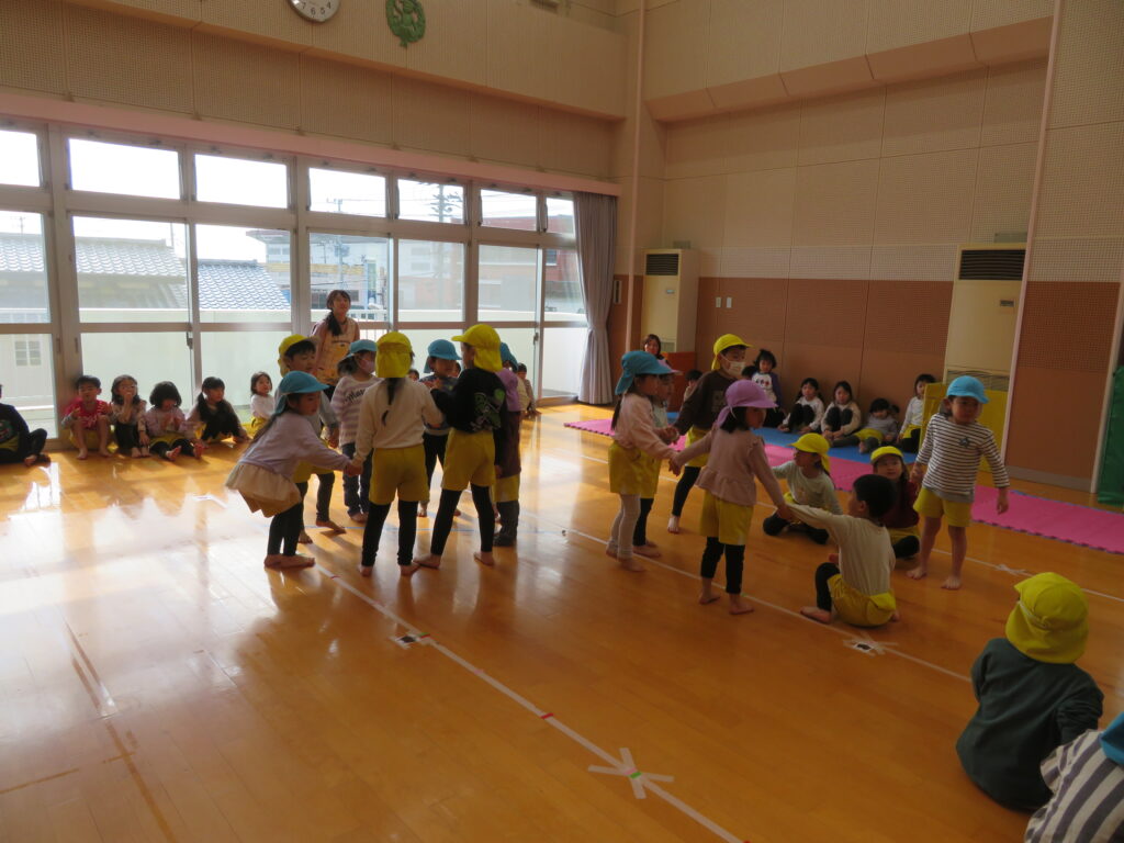 みんなで猛獣狩りにいこうよ!をしました。ルールをしっかり理解して楽しむ子どもたち。他クラスのお友だちとも仲良くすることができました(*^_^*)