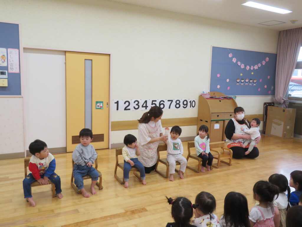 新しいお友だちも参加して緊張ぎみの4月生まれの誕生会。先生と一緒に座って返事をしたり、お話しを聞いたりして楽しみました♪。